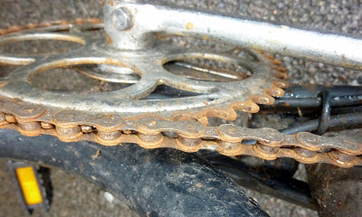 I remained on the no lubrication scenario, so far, but I did lightly spray the sideplates with thin oil and wipe clean them up a bit. I also cleaned up the chainwheel and the rear hub sprocket, and gave them a light oiling.